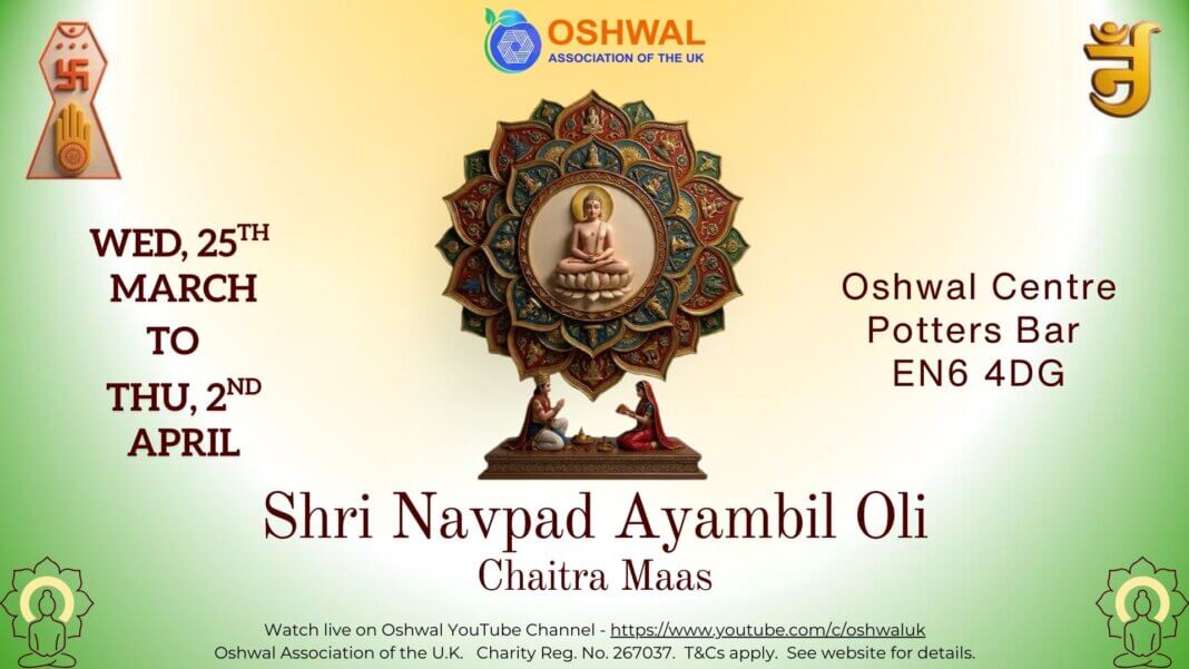 A very warm invitation to you all to join in the auspicious Shri Navpad Ayambil Oli for members of all nine areas, organised by the Oshwal Association of the U.K, beginning Wed, 25th Mar for 9 days.