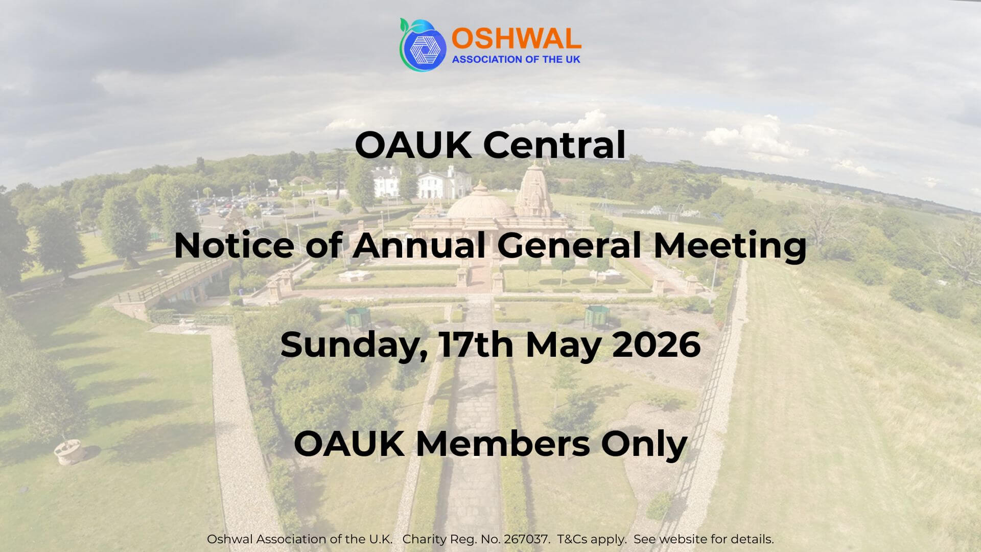 Please take notice that the 55th Annual General Meeting shall take place on Sunday 17th May 2026 at 2.00pm at L.V. Hall, Oshwal Centre, Coopers Lane Road, Northaw, EN6 4DG.