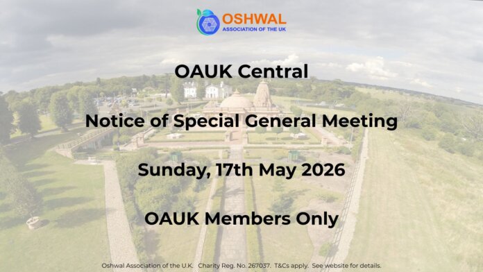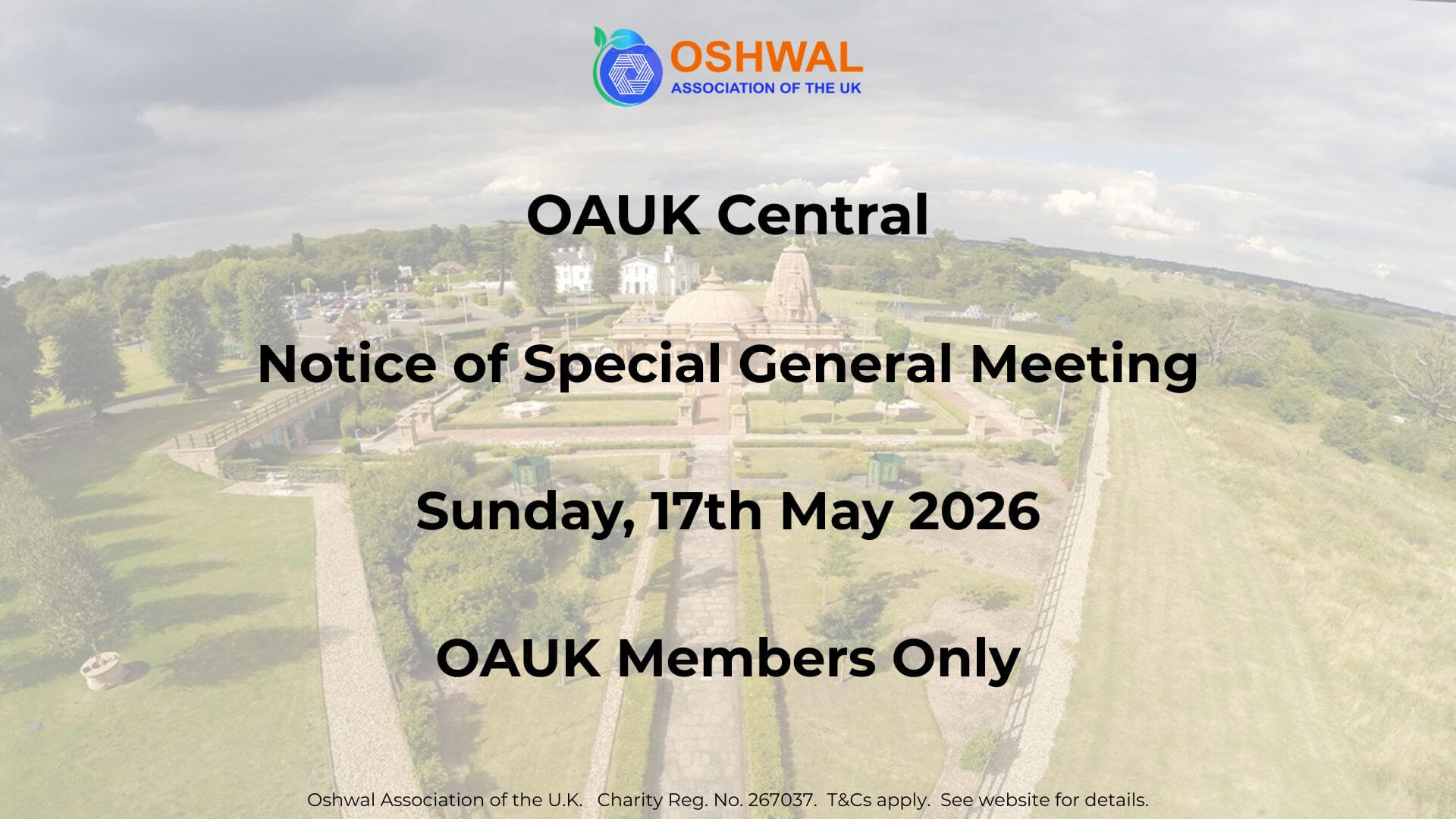 The members of OSHWAL ASSOCIATION OF UK are hereby given NOTICE in accordance with Clause 19.2 of the Constitution for a Special General Meeting to be held on Sunday 17th May 2026 at 11.00 AM (Doors will open at 10.30am) at Oshwal Centre, L.V. Hall, Coopers Lane Road, Northaw, Hertfordshire EN6 4DG, for the following purposes: